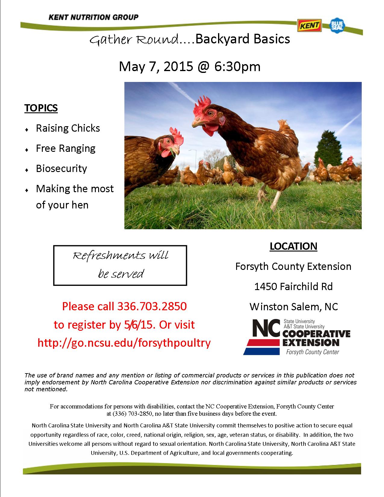 Join us on Thursday, May 7th at 6:30 PM at the Forsyth County Extension Center at 1450 Fairchild Road, Winston-Salem, to learn about raising chicks, free ranging your hens, biosecurity, making the most of your hens and more. Refreshements will be served. Please visit http://go.ncsu.edu/forsythpoultry before May 6th to register so that we know how many people to plan for.