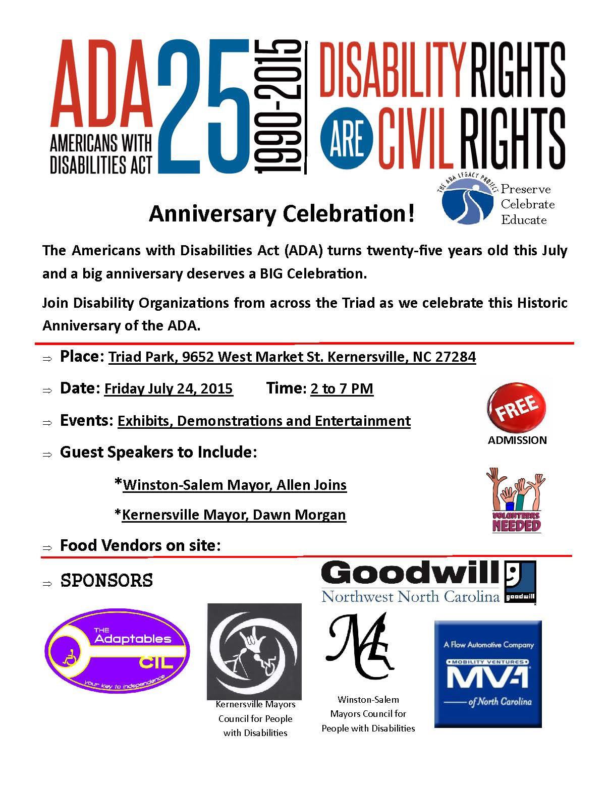 Join us on Friday, July 24th at Triad Park from 2PM-7PM for the ADA’s 25th Anniversary Celebration!