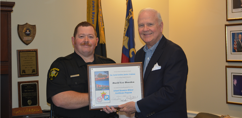 The Forsyth County Sheriff’s Office is proud to announce that Deputy D. L. Bowden recently completed the School Resource Officer Certificate Program at the North Carolina Justice Academy. Deputy Bowden is the 172nd law enforcement officer to receive the certificate.