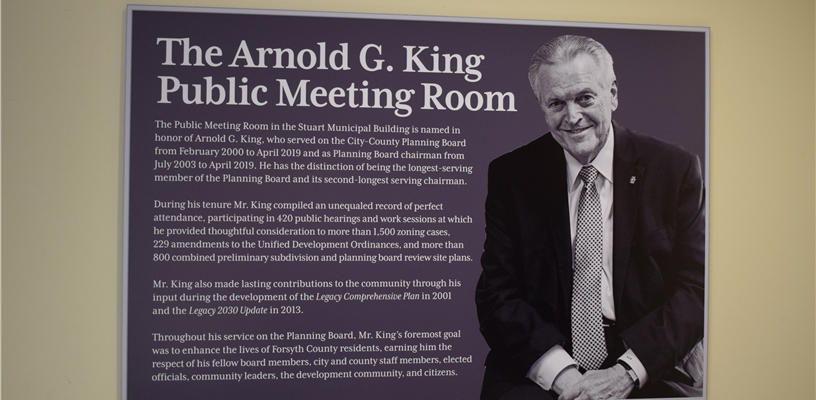 A dedication ceremony was held on June 13 for the Arnold G. King Public Meeting Room in the Stuart Municipal Building. The renaming was approved by the Winston-Salem City Council to honor King’s long service.