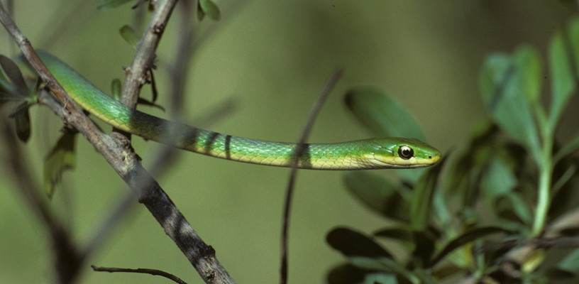 If you guessed green snake you’re right, or more specifically, the rough green snake, (Opheodrys aestivus) a close relative to the smooth green snake which ranges farther north. The “roughness” of this snake comes from a raised line running the length of each scale, a characteristic known as “keeled”.