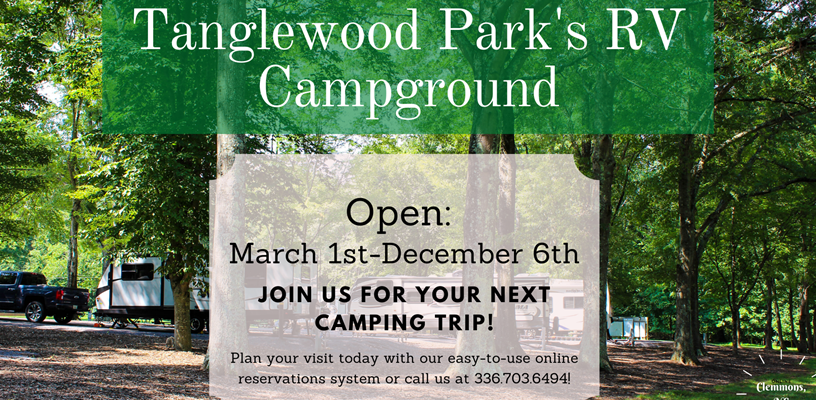 The Tanglewood Park RV Campground will be opening March 1, 2020. The 2020 season will run through December 6, 2020. For reservations, please call 336-703-6494 or visit http://rvtanglewood.com/