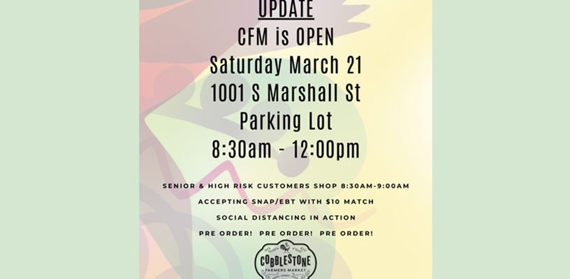 Cobblestone Farmer's Market located at 1001 South Marshall Street Parking Lot in Winston Salem will be open Saturday, March 21st between 8:30 a.m. - 12 p.m. CFM asks that seniors and/or high risk customers shop between 8:30 and 9 a.m. CFM accepts EBT/SNAP.