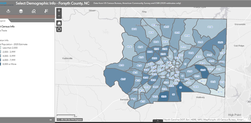 It’s one of many interactive maps in the Map Gallery on MapForsyth’s website. The Census Info Map uses estimates for 2020 statistics. You can click on a Census Tract to see demographic information on it. Options located in the upper left of the map allow users to search for a tract using an address, choose layers to see different information, search by tract number, or select multiple tracts. You can click on the arrow at the bottom of the map to open an attribute table listing all or selected tracts with data that can be exported in a CSV file.