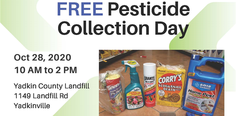 Yadkin County and NC Department of Agriculture and Consumer Services will be hosting a Pesticide Collection Day, Wednesday, October 28, 2020. It will be held at the Yadkin County Landfill, 1149 Landfill Rd., Yadkinville. The collection will be from 10:00 AM - 2:00 PM.