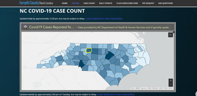 The two new dashboards were created by MapForsyth using data supplied by the NC Department of Health and Human Services and Forsyth County Department of Public Health. They’re available on Forsyth County’s COVID-19 page.