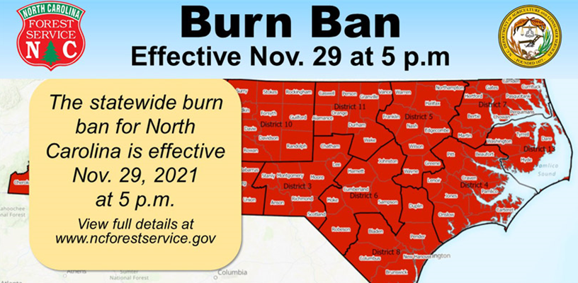 On November 29, 2021, at 5 pm, the North Carolina Forestry Service issued a burning ban for all North Carolina counties. This burn ban includes all open burning and cancels all burn permits until further notice.
