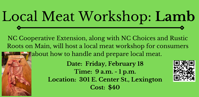 N.C. Cooperative Extension, along with NC Choices and Rustic Roots on Main, will host a local meat workshop on lamb for consumers about how to handle and prepare local meat. The workshop will be held in-person at the Davidson County Extension Office from 9 a.m. until 1 p.m. on Friday, February 18. You will be able to meet the local farmers and learn about their operations. In addition, there will be instruction on food safety, butchery demonstrations, cooking demonstrations, and more!