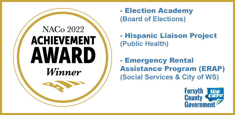 Three Forsyth County Government programs have been selected to receive 2022 Achievement Awards from the National Association of Counties (NACo).
