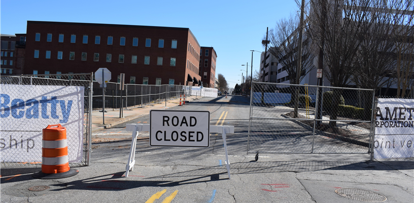 The upper portion of the plaza in front of the Forsyth County Government will be fenced off for construction starting either Friday, Jan. 27, or Monday, Jan. 30. The front of the Government Center will still be accessible by the handicap ramp in front of the building. The Government Center can also be accessed through its parking deck on Chestnut Street, which can be reached from Third Street. Contractors building the new Courthouse beside the Forsyth County Government Center will be working to reconstruct the upper portion of the plaza as part of that project.