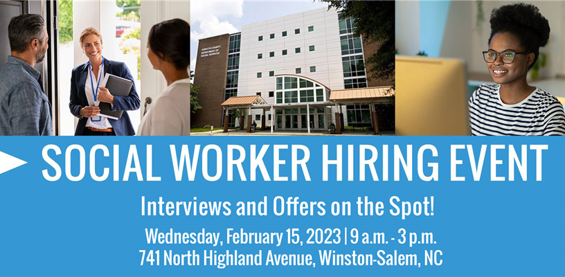 A Social Worker Hiring Event will be held at the Forsyth County Department of Social Services, 741 North Highland Ave, on Wednesday, Feb. 15, from 9 a.m. – 3 p.m.