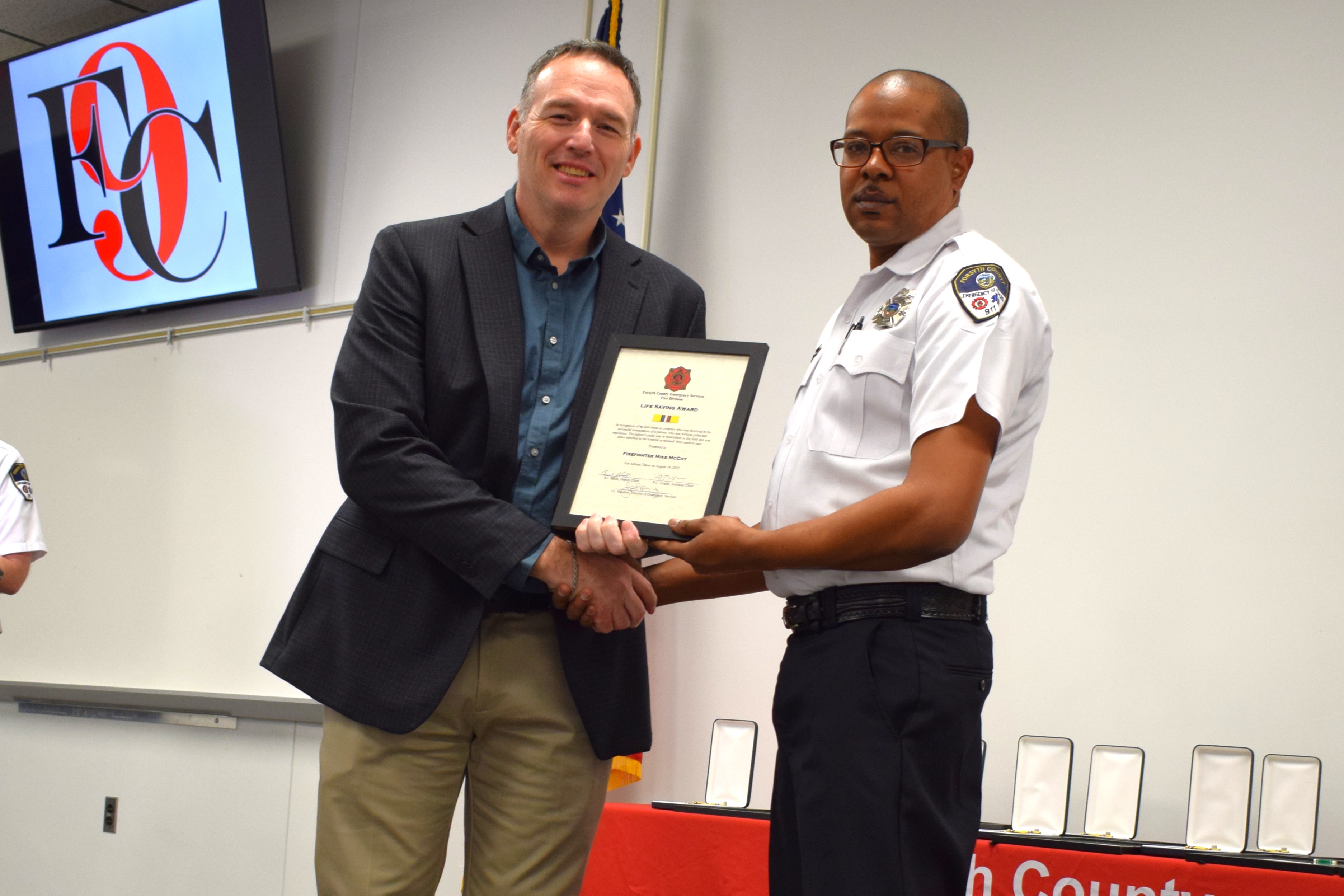 Firefighter Mike McCoy receives a Life Saving Award