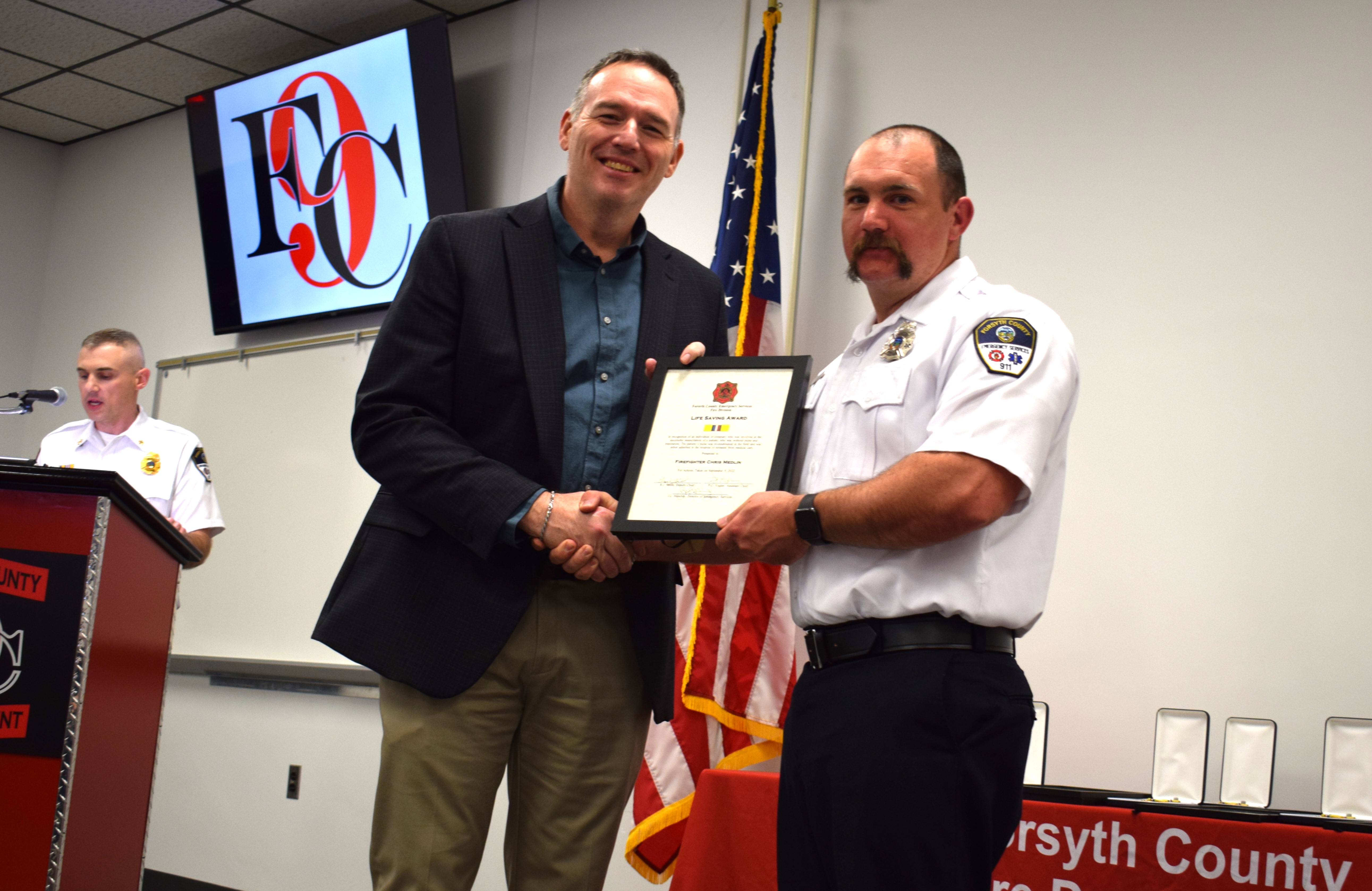 Firefighter Chris Medlin receives a Life Saving Award