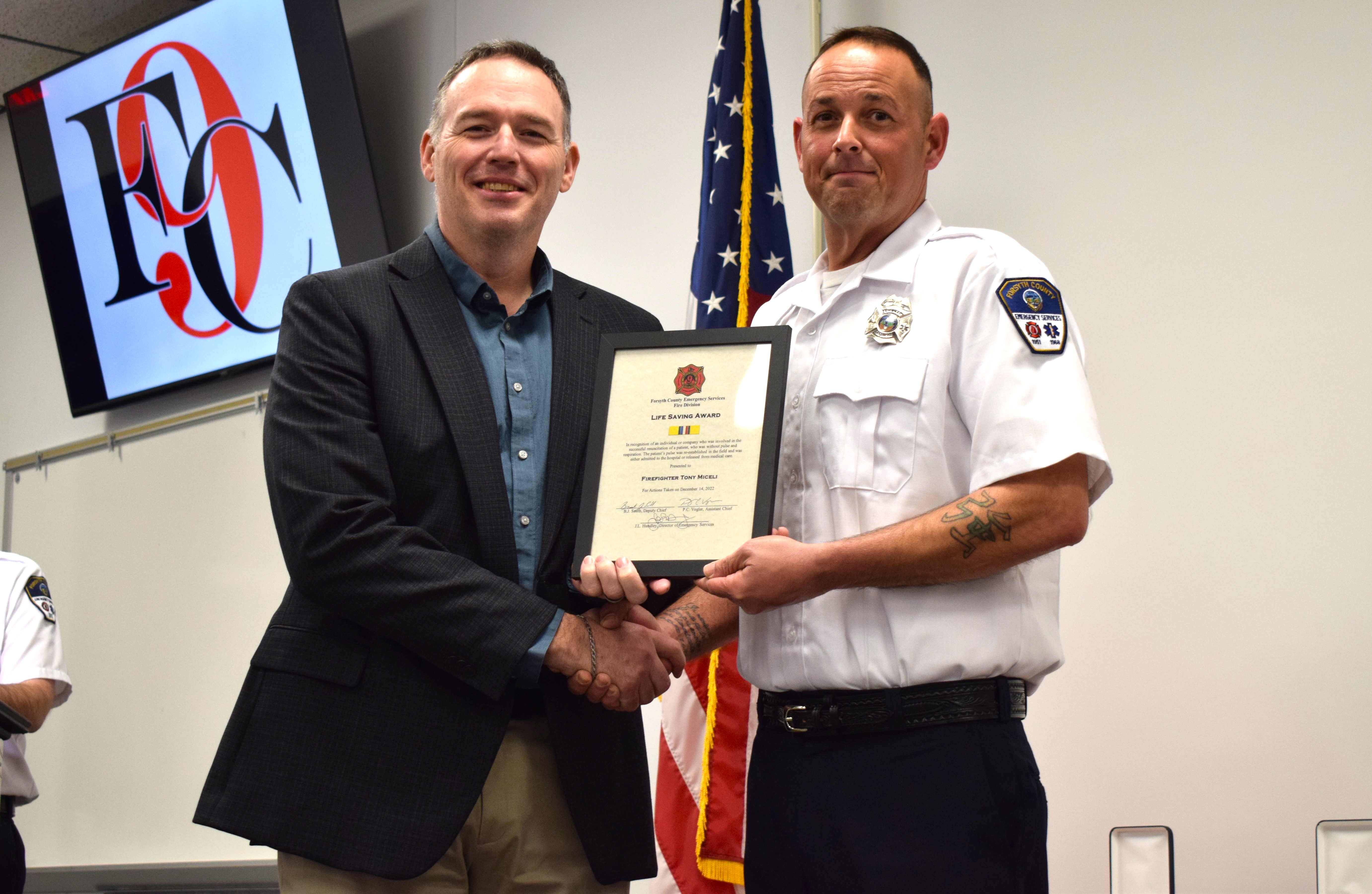 Firefighter Tony Miceli receives a Life Saving Award