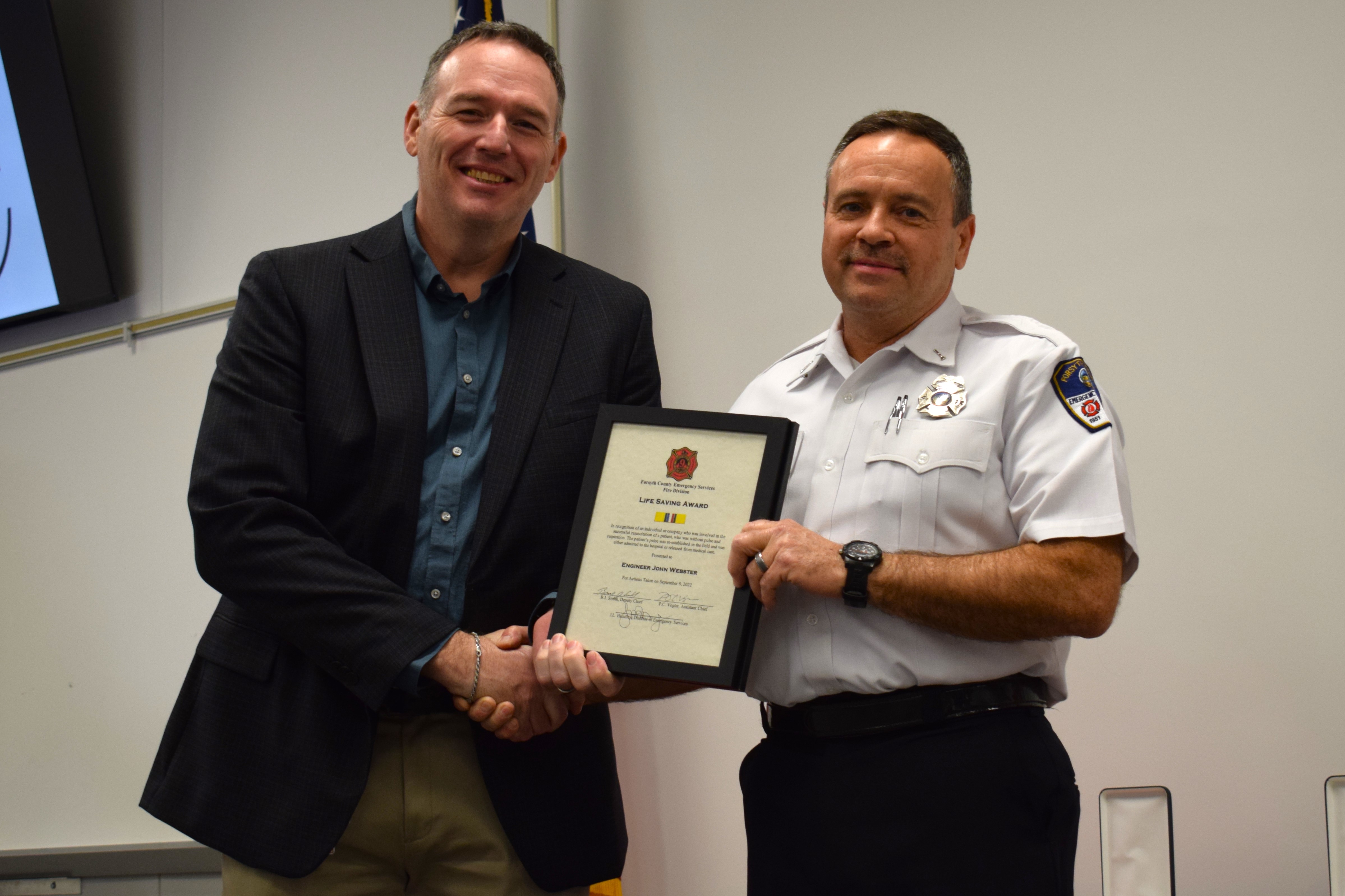 Fire Engineer John Webster receives a Life Saving Award