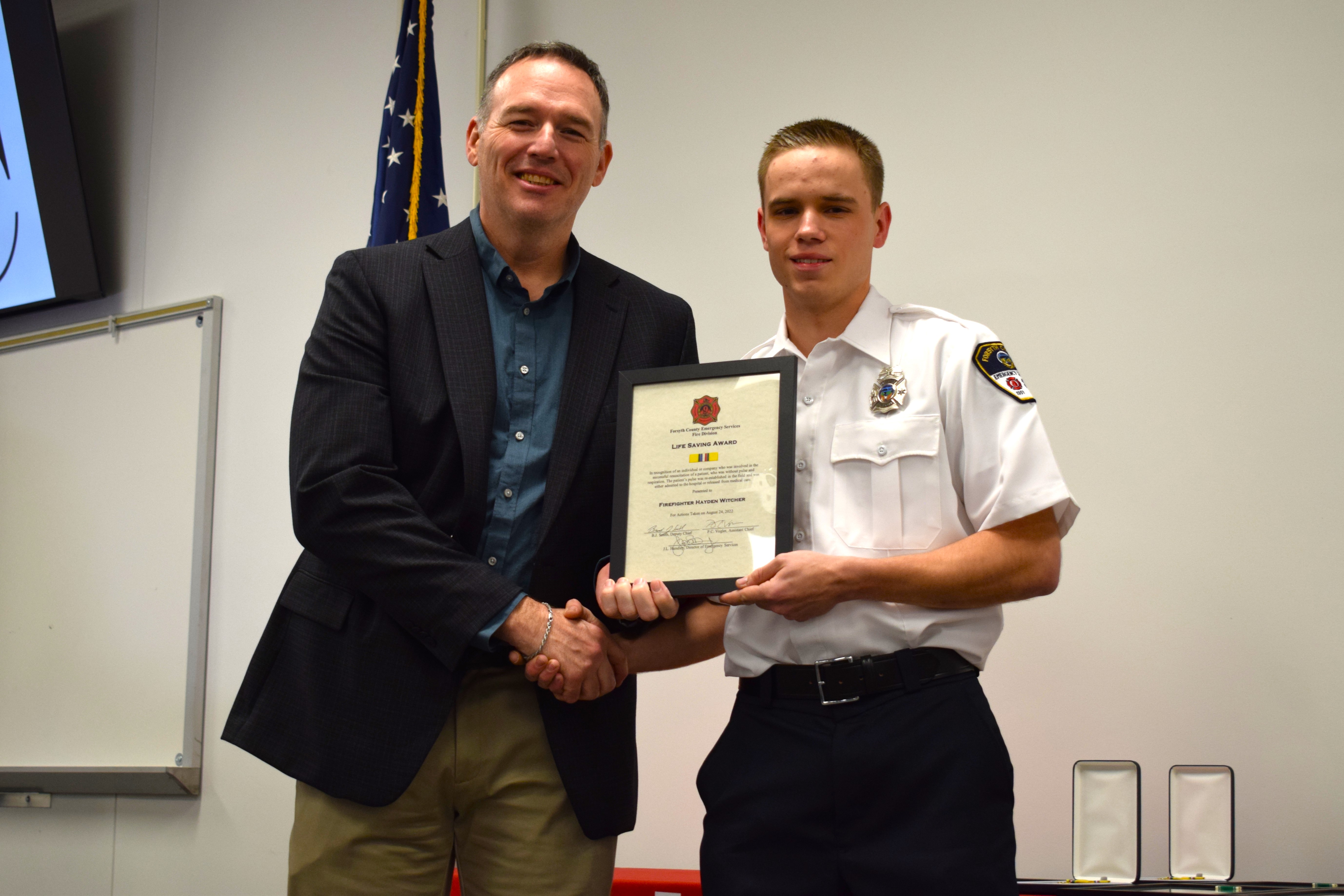 Firefighter Hayden Witcher receives a Life Saving Award