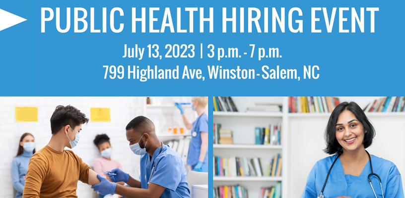A Public Health hiring event will be held July 13 from 3-7 p.m. at the Forsyth County Department of Public Health, 799 N. Highland Avenue.