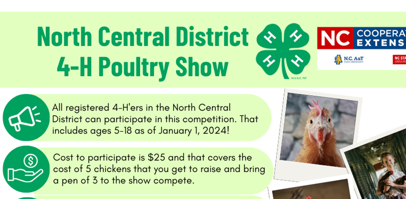 The North Central District 4-H Poultry Show will be held the morning of Saturday, May 4, 2024 in Winston-Salem. Youth ages 5-18 that wish to show birds at this show, should: