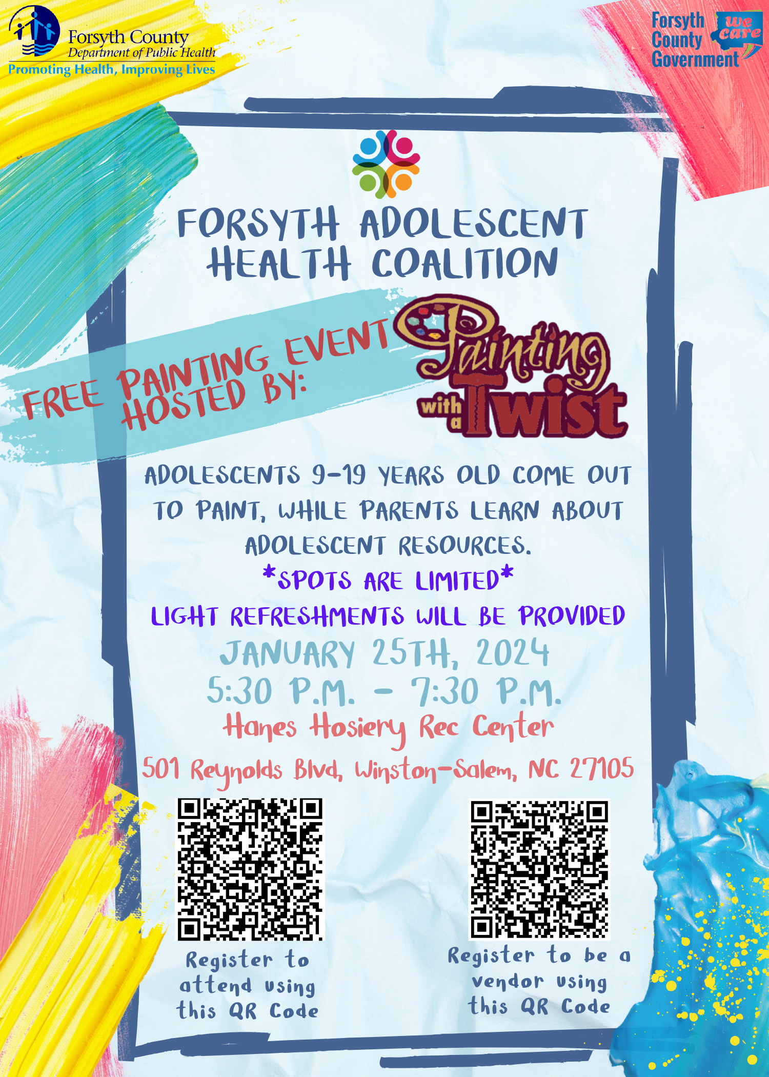 The Forsyth Adolescent Health Coalition will be having a painting event to relaunch the Coalition and reintroduce itself to the public on Jan. 25 from 5:30-7:30 p.m. at Hanes Hosiery Rec Center, 501 Reynolds Blvd.