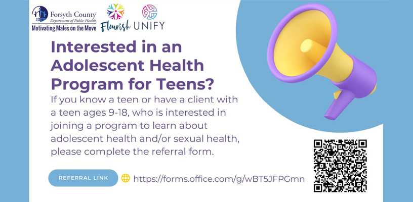 FCDPH's Adolescent Health Programs are officially accepting applications for the 2024-2025 school year. Flourish, Motivating Males on the Move (M3), and Unify will each be accepting 25 participants each and each program will run from September 2024-June 2025. Along with health education, all programs provide free transportation, snacks, activities, games, and field trips to participants throughout the year. If you are interested in receiving more information or applying, please fill out the referral form using the link or QR Code in the flyer. Enrollment applications can also be found at https://forsyth.cc/HHS/teen_services.aspx (Enrollment form & transportation waiver required). If you have any questions, please reach out to the Adolescent Health Coordinator at 336-703-3180 or langleam@forsyth.cc