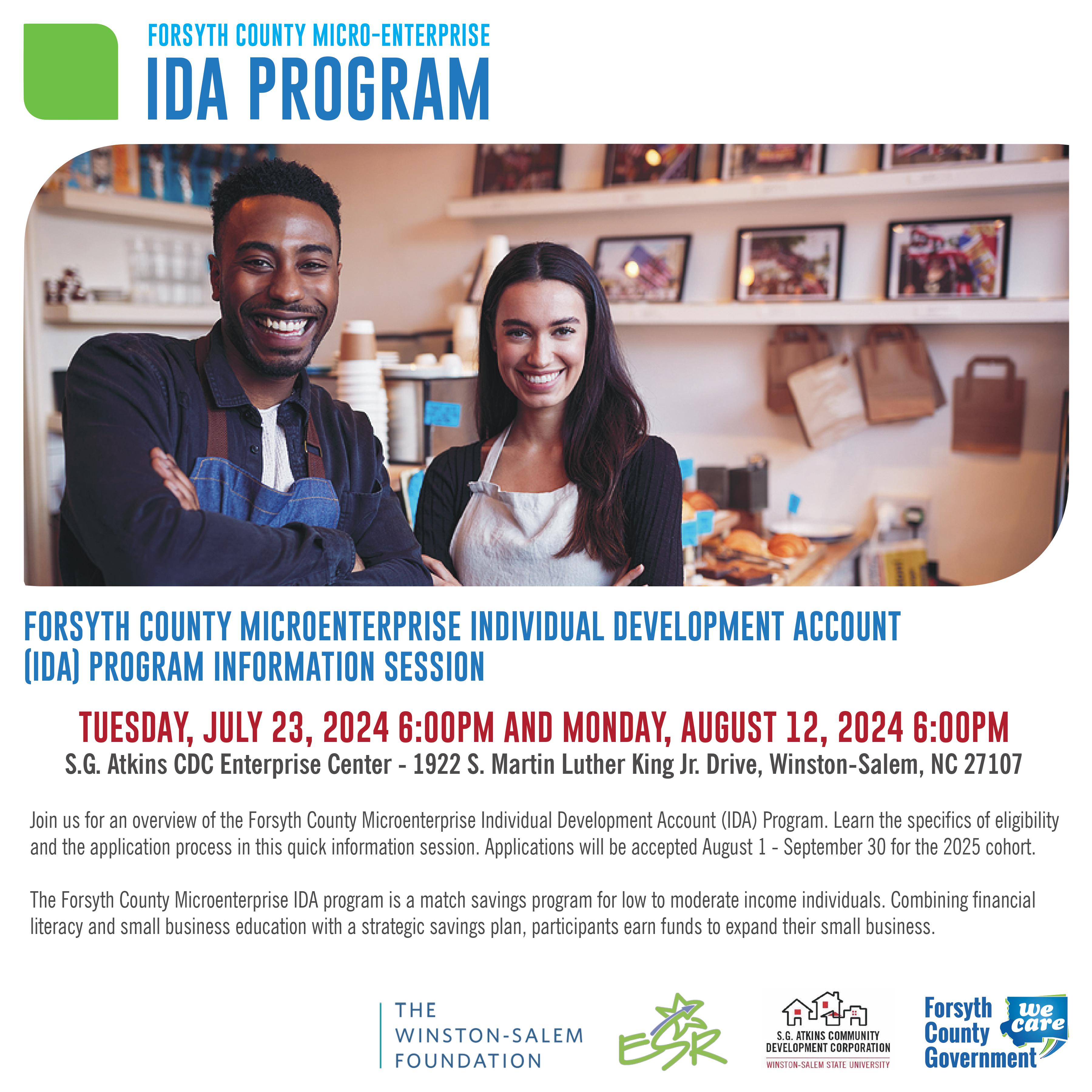 Forsyth County Community & Economic Development will be accepting applications for its upcoming Micro-Enterprise Individual Development Account (IDA) Program beginning August 1 through September 30. The IDA program is a match savings program for low to moderate income persons who operate a business in Forsyth County. Participants will receive financial literacy education provided by Experiment in Self Reliance (ESR) and small business training provided by S.G. Atkins Community Development Corporation. Upon completion of the program, participants will be eligible to receive matching grants up to $16,000 toward an approved business asset.