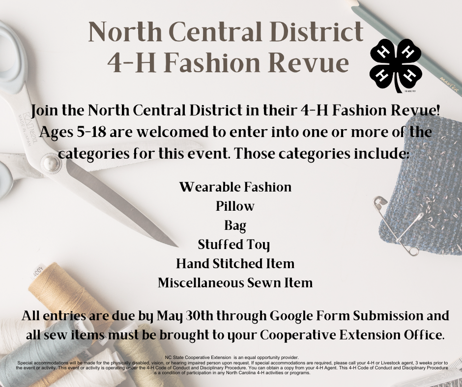 * If you plan to be in the Wearable Fashion Revue, make sure to mark your calendars also for an interview on June 10th via Zoom and to model your garment at District Activity Day at A&T University on June 21st.*