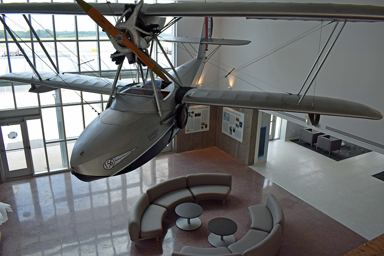 The restoration also honors the past, with photos and displays showcasing the storied history of the airport lining the walls. In the main lobby, a1930 Savoia Marchetti S-56 hangs from the ceiling. This aircraft is the same make and model that Zachary Smith Reynolds used in his flight from London to Hong Kong in 1931-32.