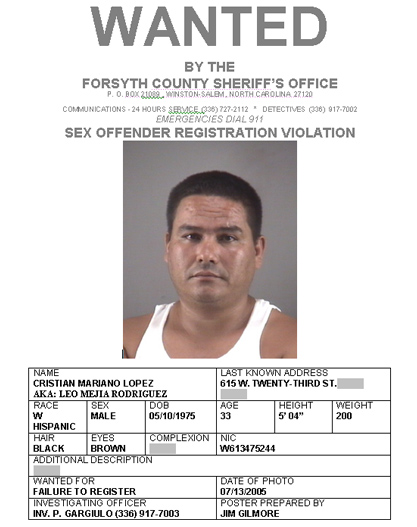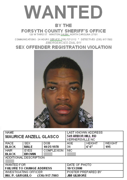 The following persons are wanted by the Forsyth County Sheriff's Office. These persons are listed as sex offenders and have failed to register or maintain their address and/or have given false information. If you know the whereabouts or have any information on these individuals, please contact the Forsyth County Sheriff's Office or your local law enforcement agency. Do not attempt to apprehend any of these individuals.